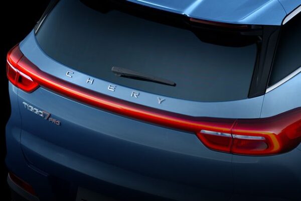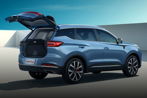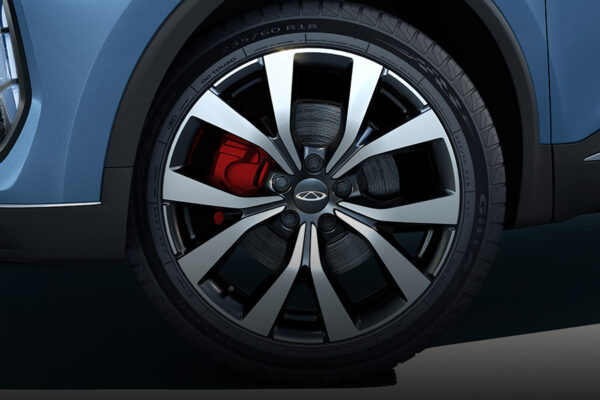 Desain eksterior Tiggo 7 Pro menampilkan grille depan bergaya “Matrix Diamond”, lampu LED otomatis dengan fungsi “Welcome Home”, dan velg alloy 18 inci berwarna glossy, memberikan kesan mewah dan dinamis.